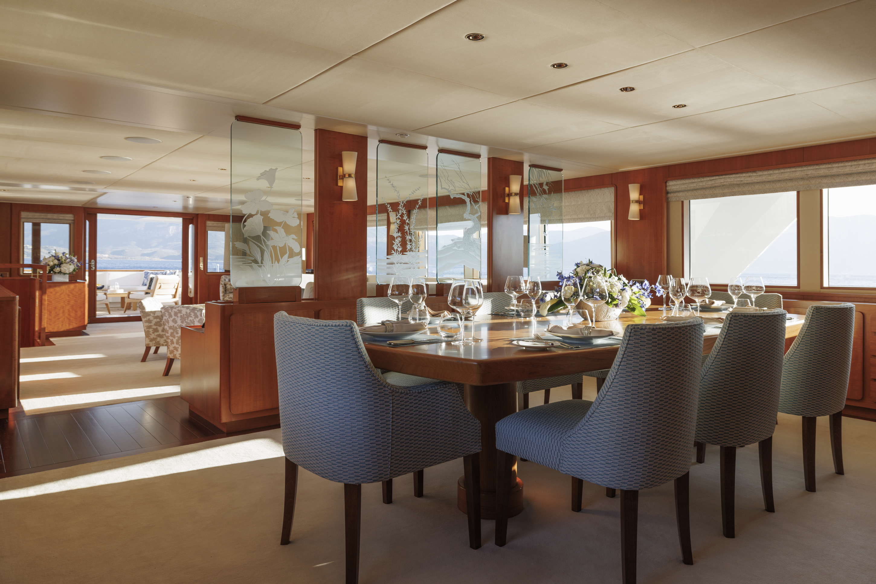 The traditional layout places the lounge aft in the main salon and the dining area forward. The lounge offers a selection of beautiful sofas and occasional chairs surrounding a coffee table with a smaller bar height table and chairs.