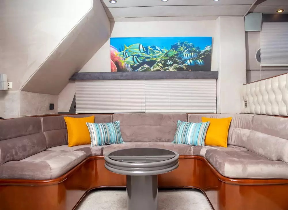 The cosy main salon is well designed for six guests with a U-shaped sofa with a central coffee table, raised dinette forward to port and helm controls further forward to starboard. The décor is a blend of gloss wood and plush soft furnishings. The main stairs down to the lower deck are to starboard amidships in the salon.