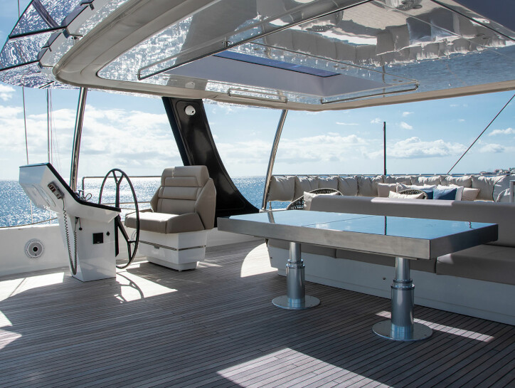 The flybridge offers sun pads, dining table and long sofa plus chairs with helm controls forward to starboard. The area is sheltered with hard roof to protect from the heat of the sun.