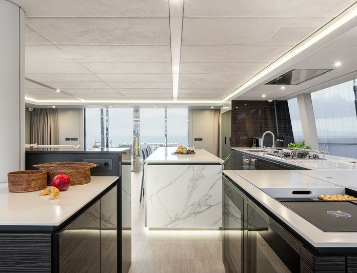 On the main deck aft there is a flexible alfresco dining area leading to the hydraulic swim platform with when raised creates a huge deck space from where the crew will launch the tender and selection of water toys.