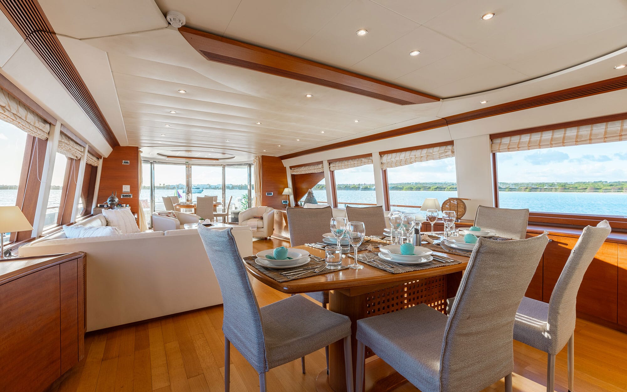 Amidships is the on-deck jacuzzi, while the forward space is filled with a dining setting to starboard and a bar and helm controls to port. The area can be covered by a soft bimini to provide shade during the charter.