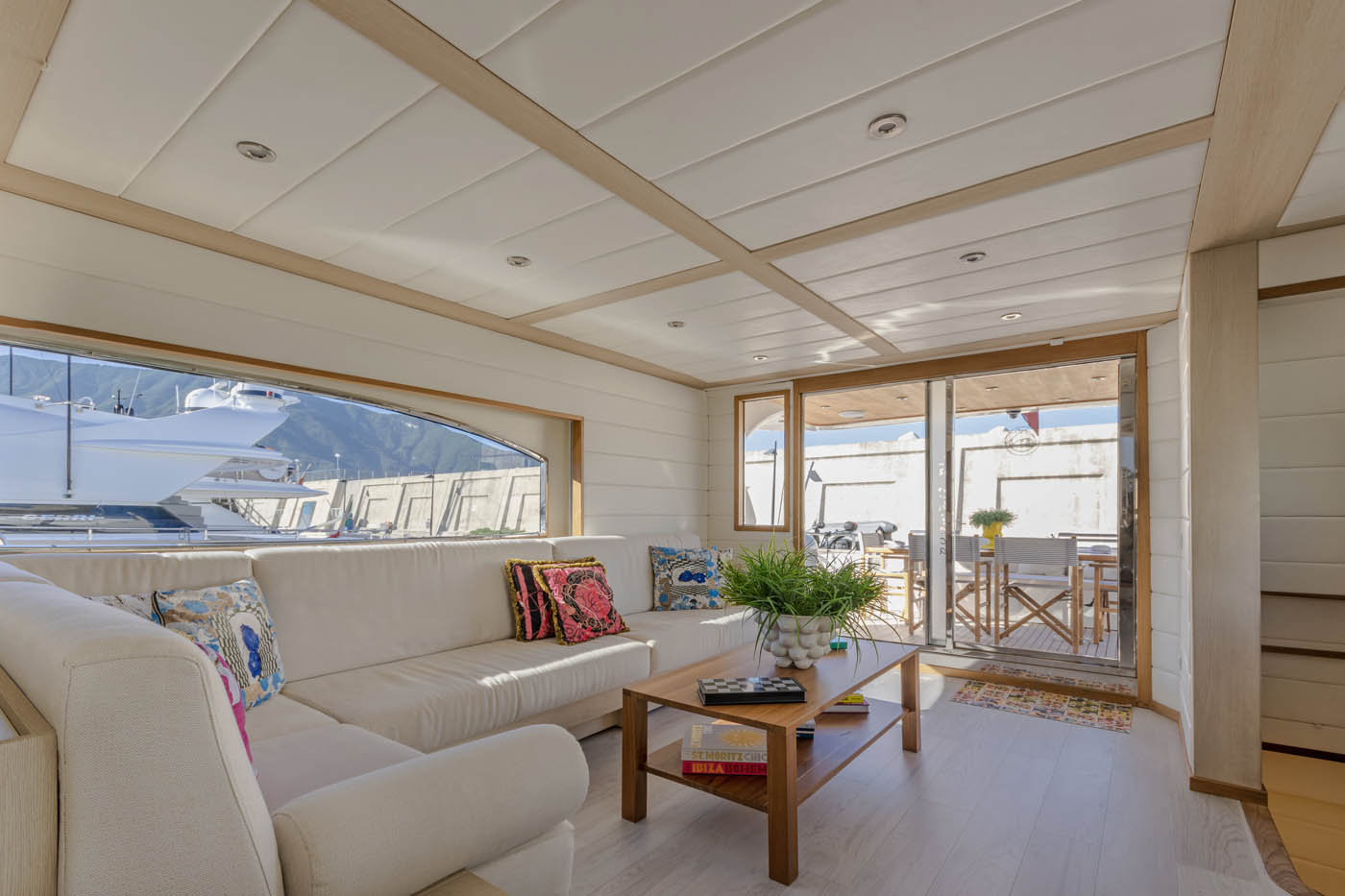 The interior is light and bright and the main salon blends seamlessly with the aft cockpit through sliding glass doors. There is a lounge space aft with an L-shaped sofa and coffee table plus wine fridge to port.