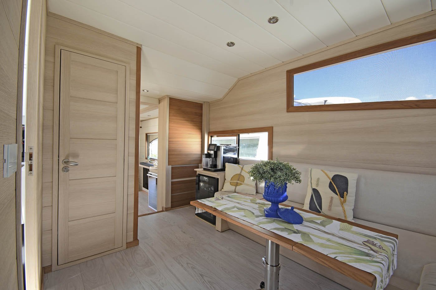 The interior is light and bright and the main salon blends seamlessly with the aft cockpit through sliding glass doors. There is a lounge space aft with an L-shaped sofa and coffee table plus wine fridge to port.