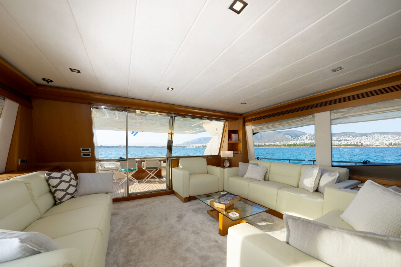 A sliding door opens from the aft cockpit into the main salon which is light and bright thanks to the wide windows and neutral soft furnishings. Two three-seater, one two-seater and one armchair create a sociable lounge space aft while an elevated dining area has a setting for eight.