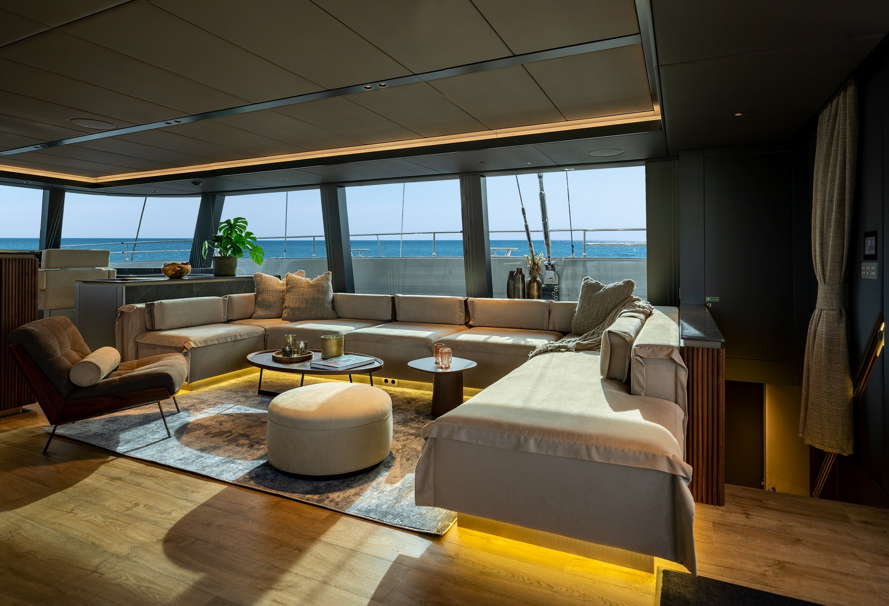 To the aft, the salon merges with the generous cockpit combining to form a huge open environment where flexibility and freedom are in abundance.