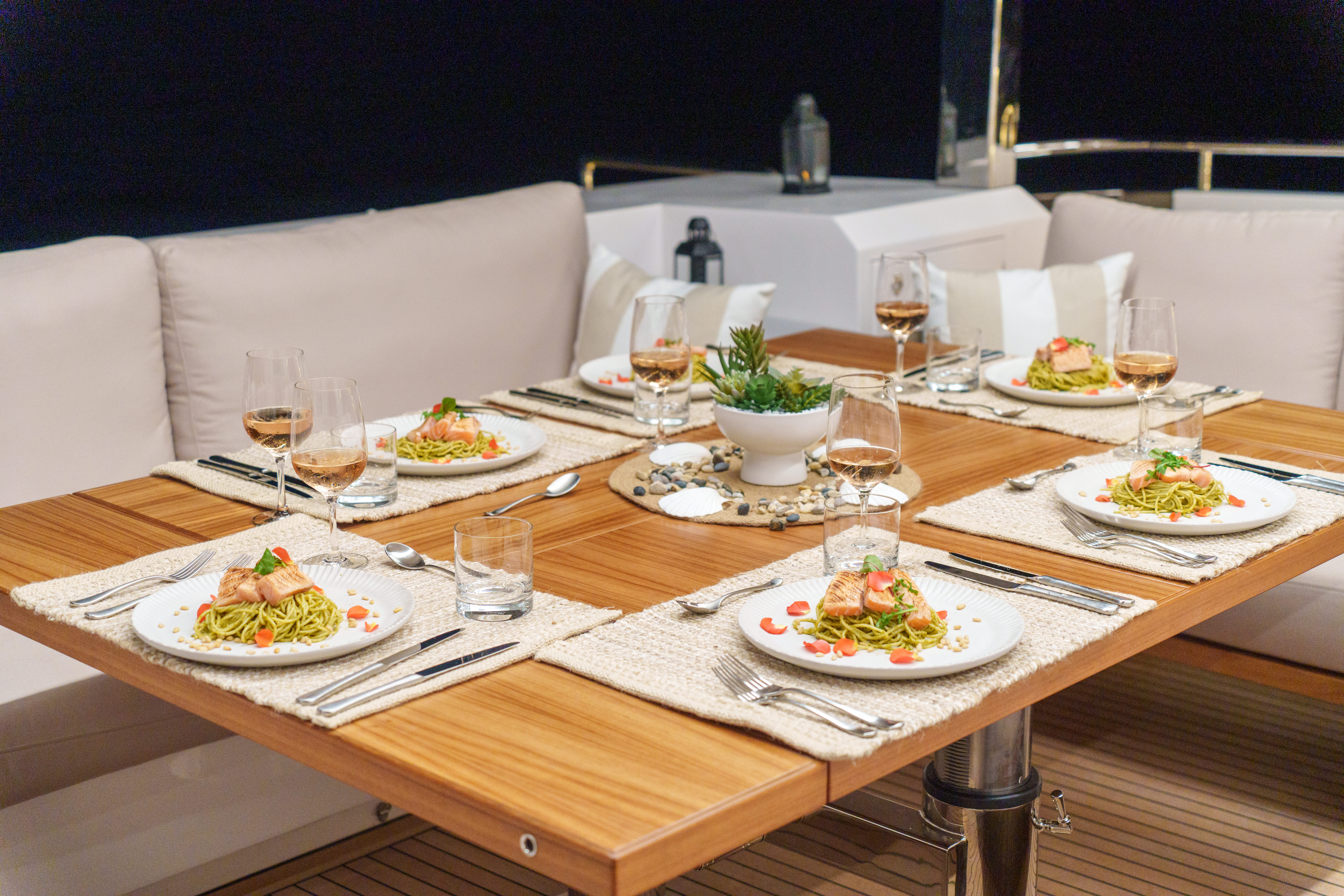 The main al fresco dining area is on the main deck aft with a flexible table and plush long sofa seating.
