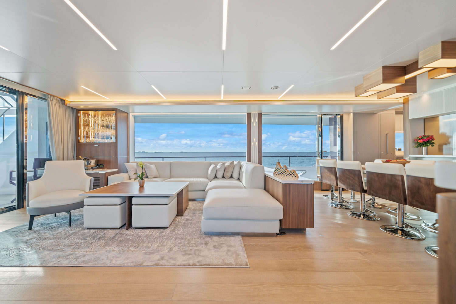 The main al fresco dining area is on the main deck aft with a flexible table and plush long sofa seating.