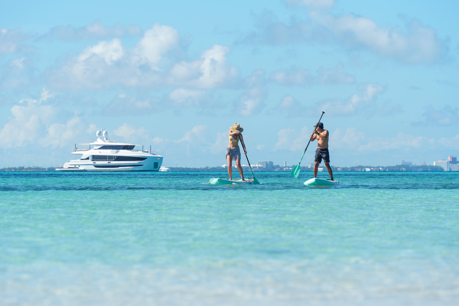 Luxury yacht RIO is a 27.43m (90') Horizon flybridge yacht built in 2022 with a distinctive rounded vertical bow, gleaming white hull and superstructure cut through with lines of dark windows. A deck jacuzzi and beautiful contemporary deck furniture finish off the exterior perfectly.