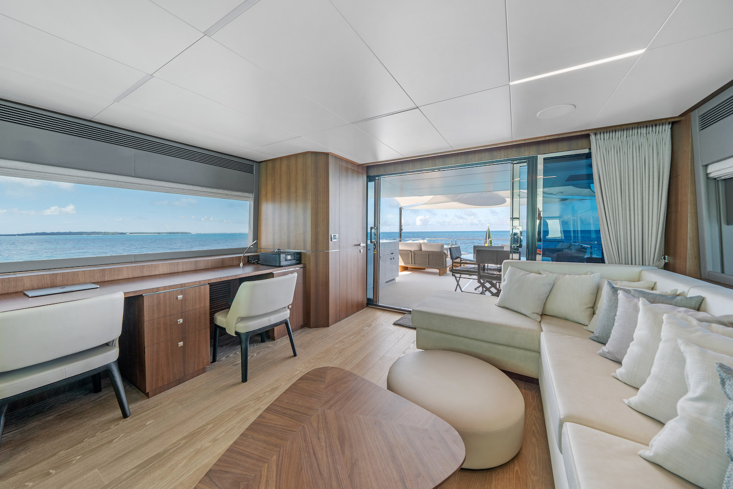 There is a lounge space, accessed directly from the main deck aft, and a forward dining area and a semi-open galley further forward to port.
