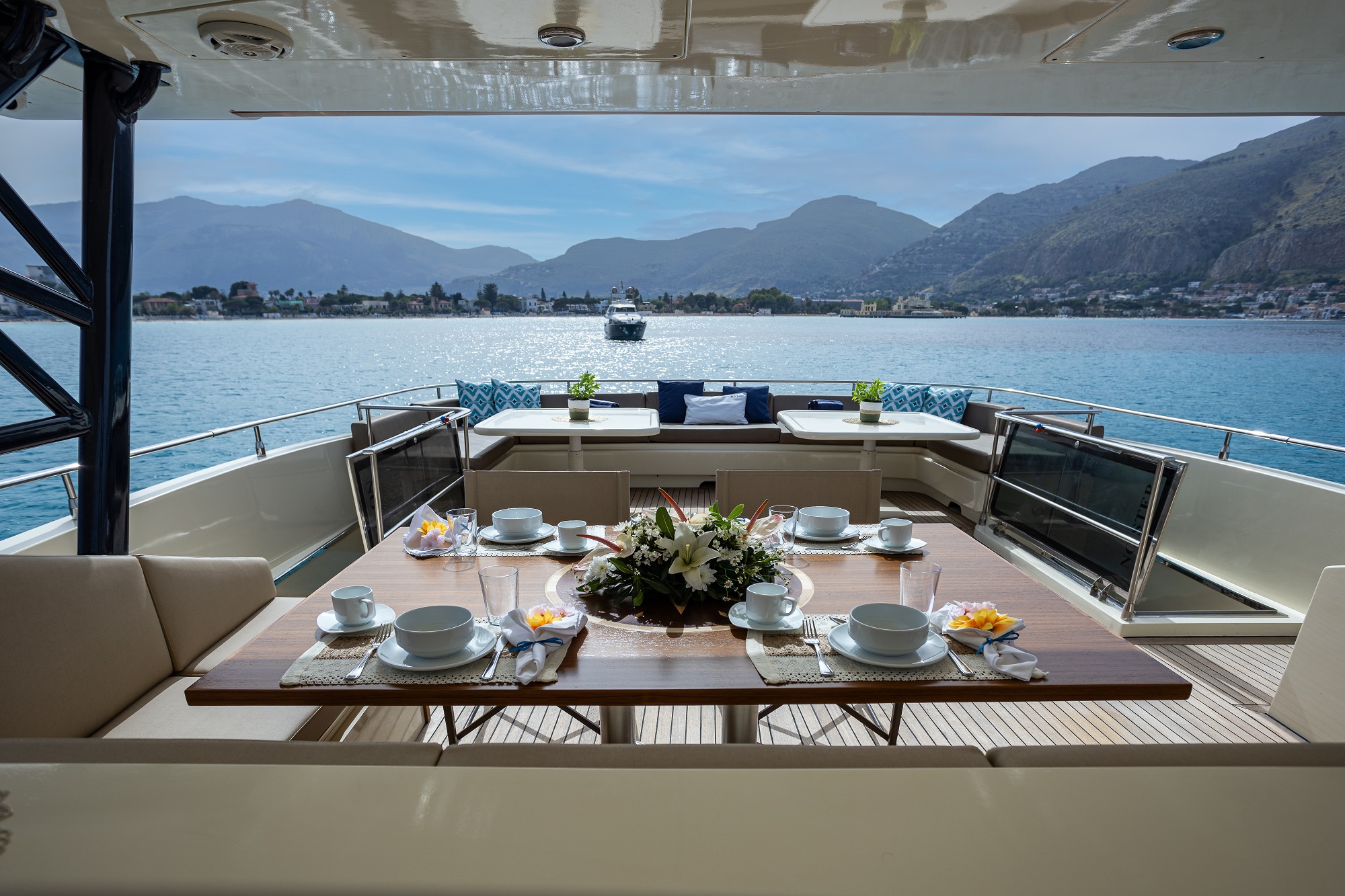 The main deck aft is perfect for leisurely al fresco meals overlooking the water edge swim platform.