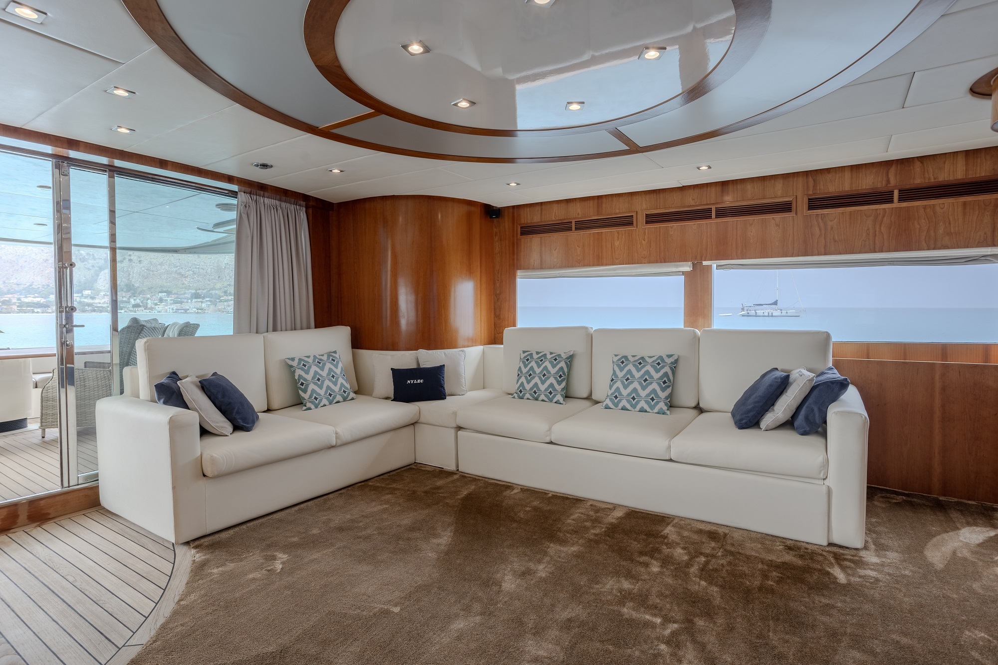 The ‘Wide Body’ concept offers full-width interiors replacing any side deck walkarounds. The yacht accommodates 8 guests in 4 cabins and has a crew of three on board. She was refitted in 2023.