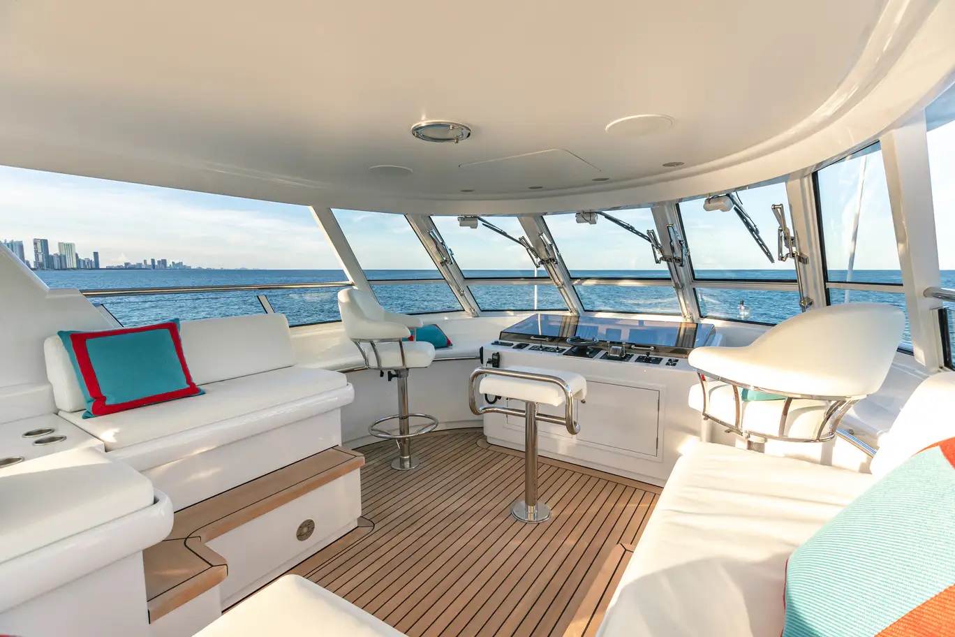 The flybridge hosts a helm station and cosy little lounge area for guests to hang out with the captain.