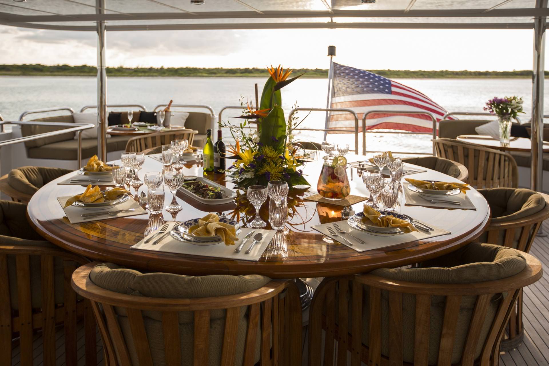 The main deck boasts an airy salon, which hosts formal dining area and lounge.