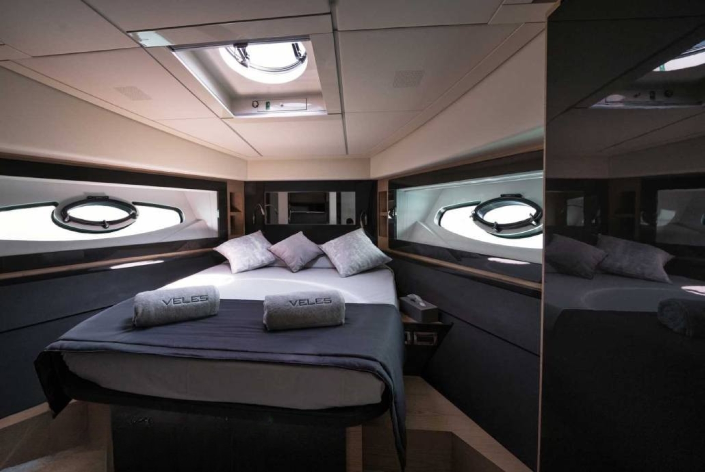 Motor yacht VELES is a fast and furious 20.80m (68' 3") Pershing 70 with a stylish silver hull and space for six guests in three ensuite cabins. She has a crew of 2 on board.