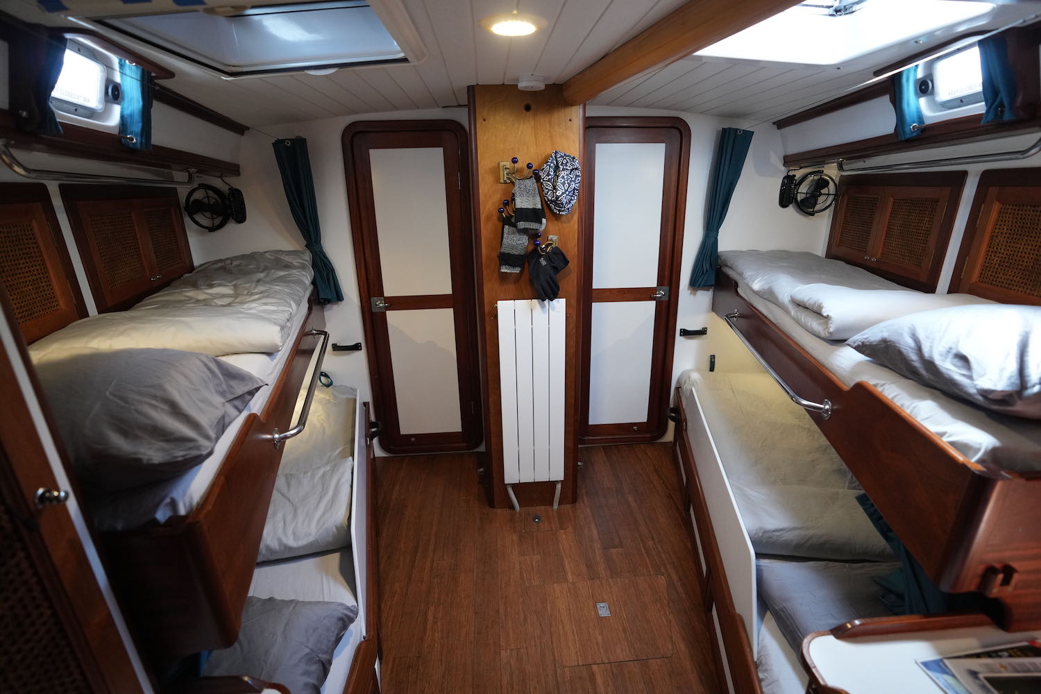 The spacious forward private cabin sleeps 4 people in built-in single berths. The midship starboard cabin can sleep up to 2 more. The aft cabin is for the captain and mate. Blanketed with ample 64mm closed cell insulation, the extra dry toasty warmth is provided by a reliable Refleks heater and radiators fore and aft.