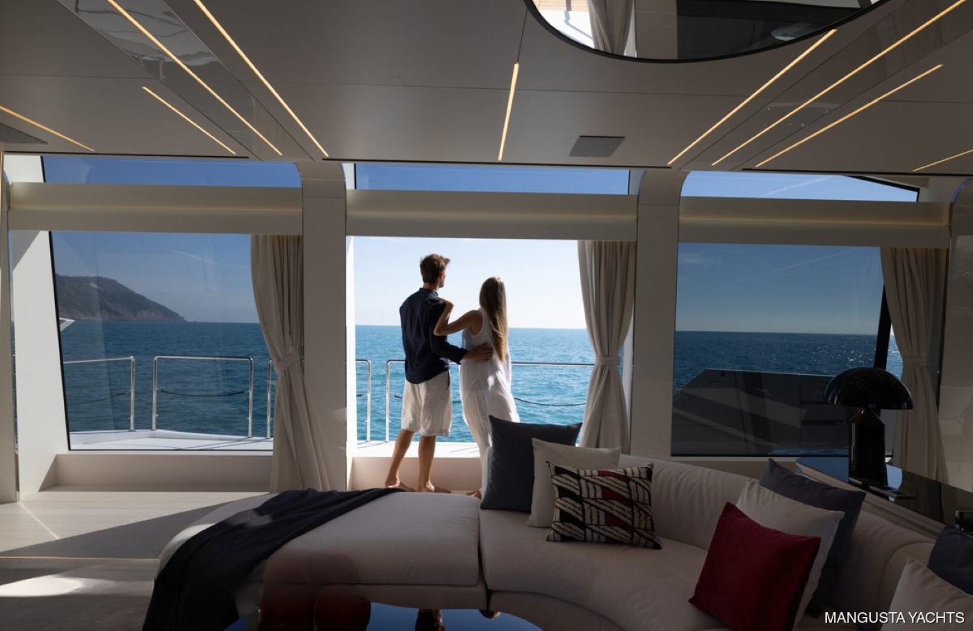 The transom door opens to create a waters-edge beach club which tucks into the stern and is accessible via two beautiful sets of teak stairs down from the main aft deck.