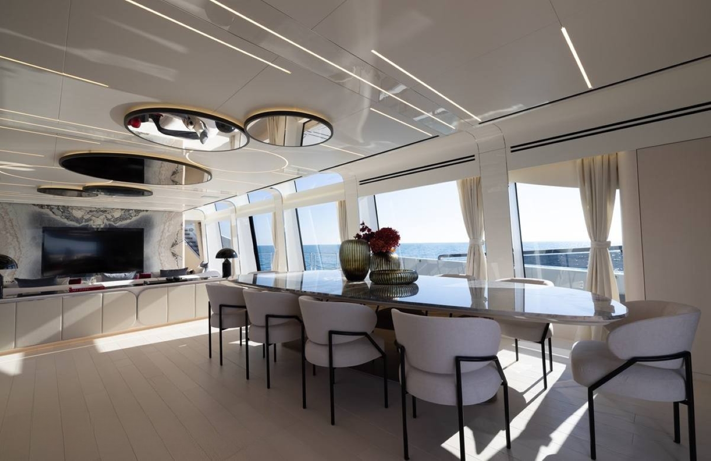 The main deck aft is very spacious and offers a 12 seater dining table and another curved sofa aft with additional armchairs.