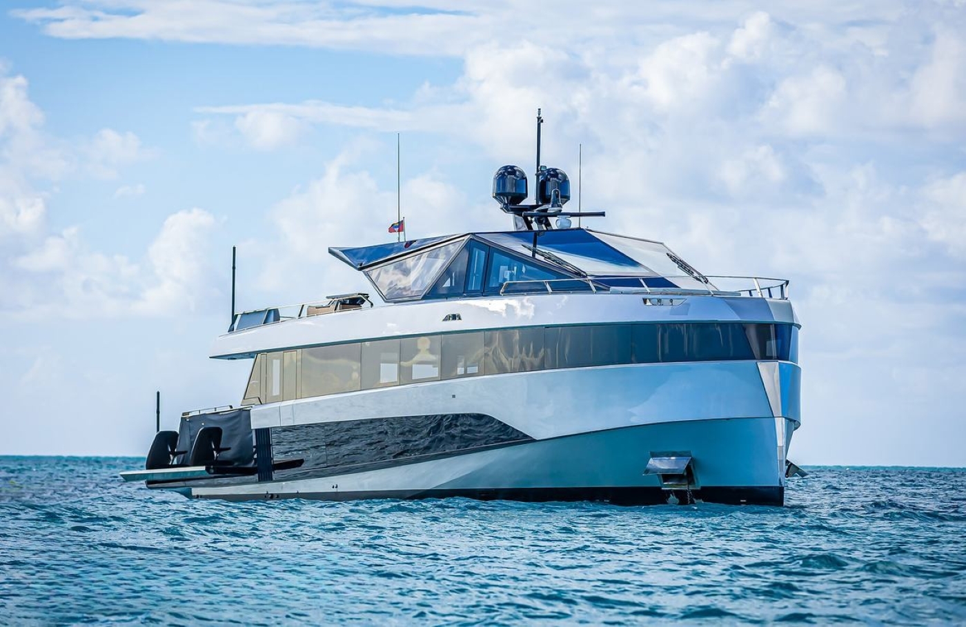 The towering 4.7m bow creates huge interior volume and gives her a unique shape which is further styled using silver paintwork and long dark windows cutting across the vessel. Elegant teak decking surrounds steps that cascade down from the aft deck to the beach club which extends with wings at the side and a hydraulic central swim platform.
