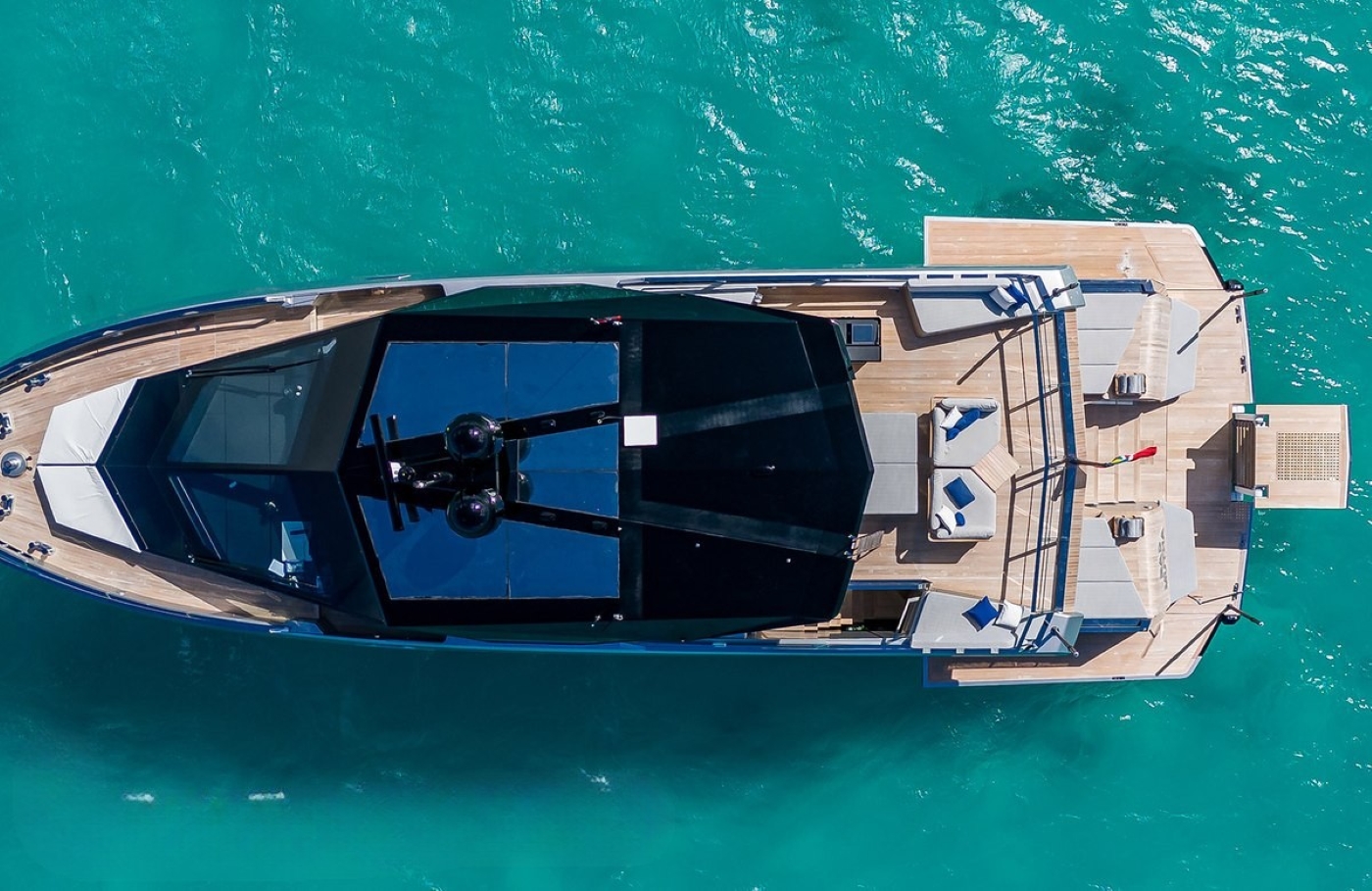 The towering 4.7m bow creates huge interior volume and gives her a unique shape which is further styled using silver paintwork and long dark windows cutting across the vessel. Elegant teak decking surrounds steps that cascade down from the aft deck to the beach club which extends with wings at the side and a hydraulic central swim platform.