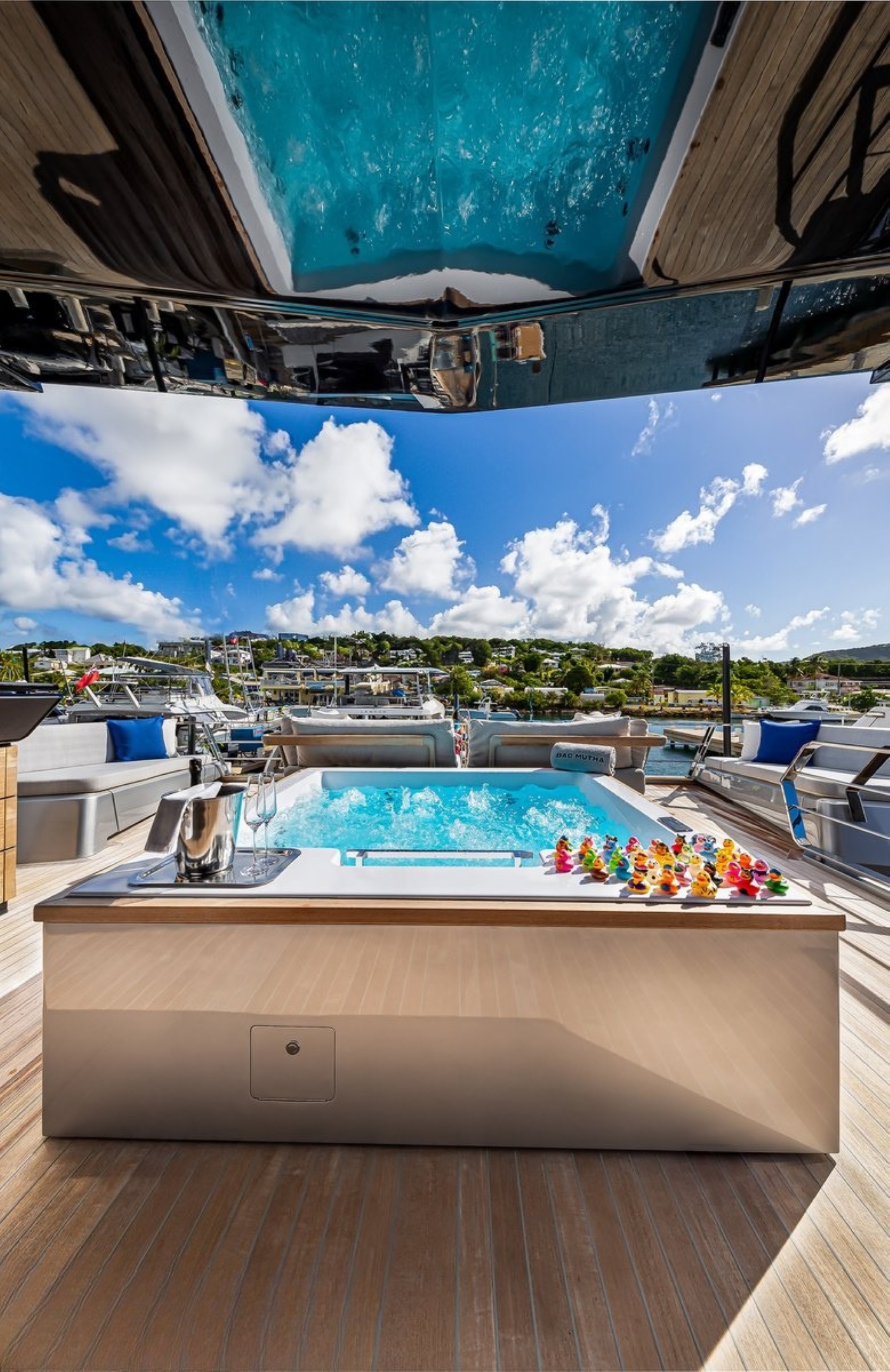 NOTABLE FEATURES OF BAD MUTHA: ~Beach club with fold-out ‘wings’ ~Bold futuristic exterior design ~4.7m bow ~Huge upper deck with signature glass dome ~Air conditioning ~WiFi