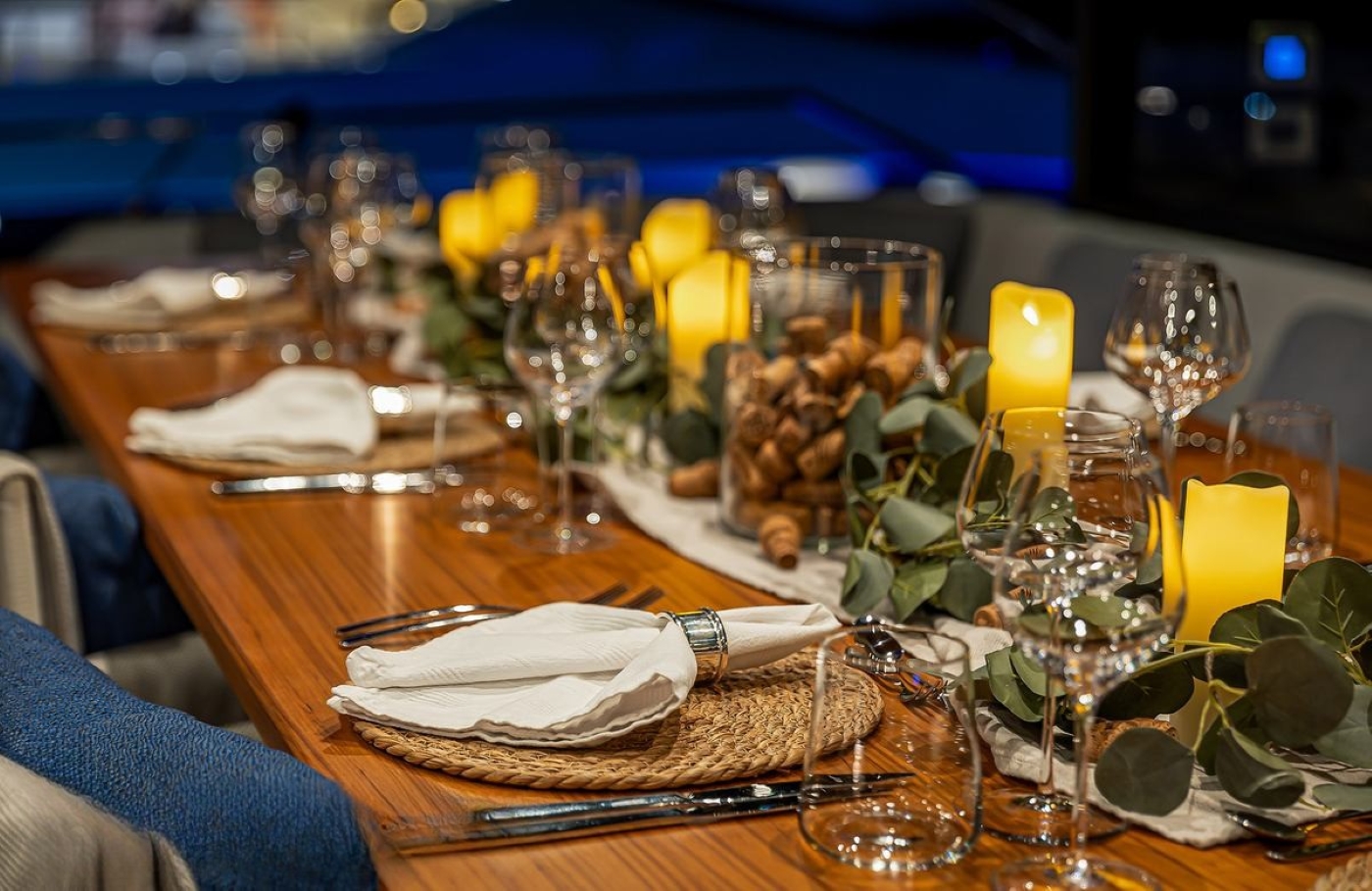 On the flybridge sun deck there is also spacious sun beds and a generous dining setting which can seat up to 10 guests. Additional dining space is on the main deck aft sheltered under the flybridge overhang.