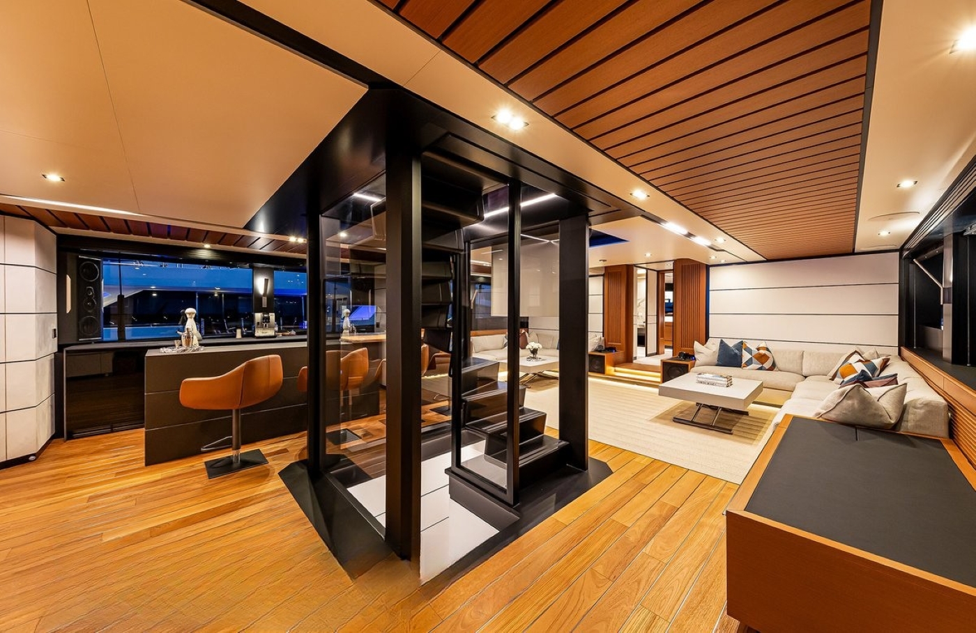 The main salon has plenty of flexible sociable space surrounding a central glass surrounded staircase. There is a dining area, bar and 2 seating areas which can transform from lounge to dining. Forward on the main deck is the master suite.
