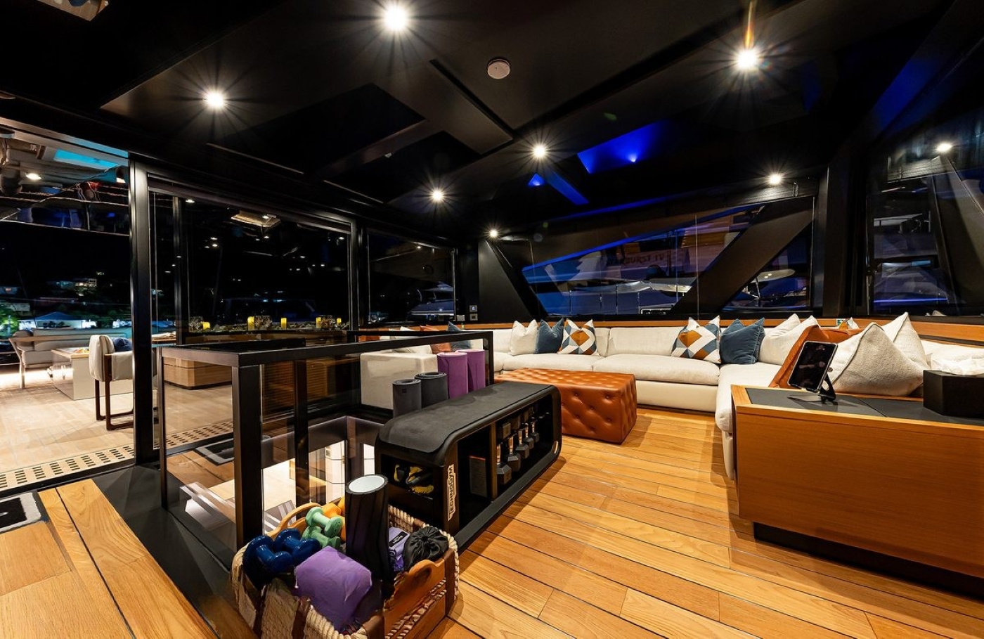 The towering 4.7m bow creates huge interior volume and gives her a unique shape which is further styled using silver paintwork and long dark windows cutting across the vessel. Elegant teak decking surrounds steps that cascade down from the aft deck to the beach club which extends with wings at the side and a hydraulic central swim platform.