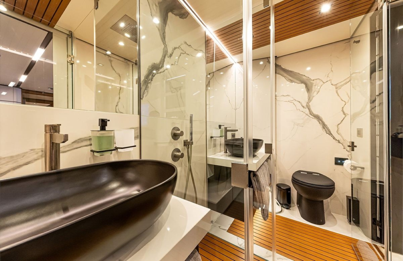 There are three further guest cabins on the lower deck, configured as one full beam VIP forward with his and hers ensuites with central shower plus two doubles, both with generous wardrobe space and ensuite bathrooms.