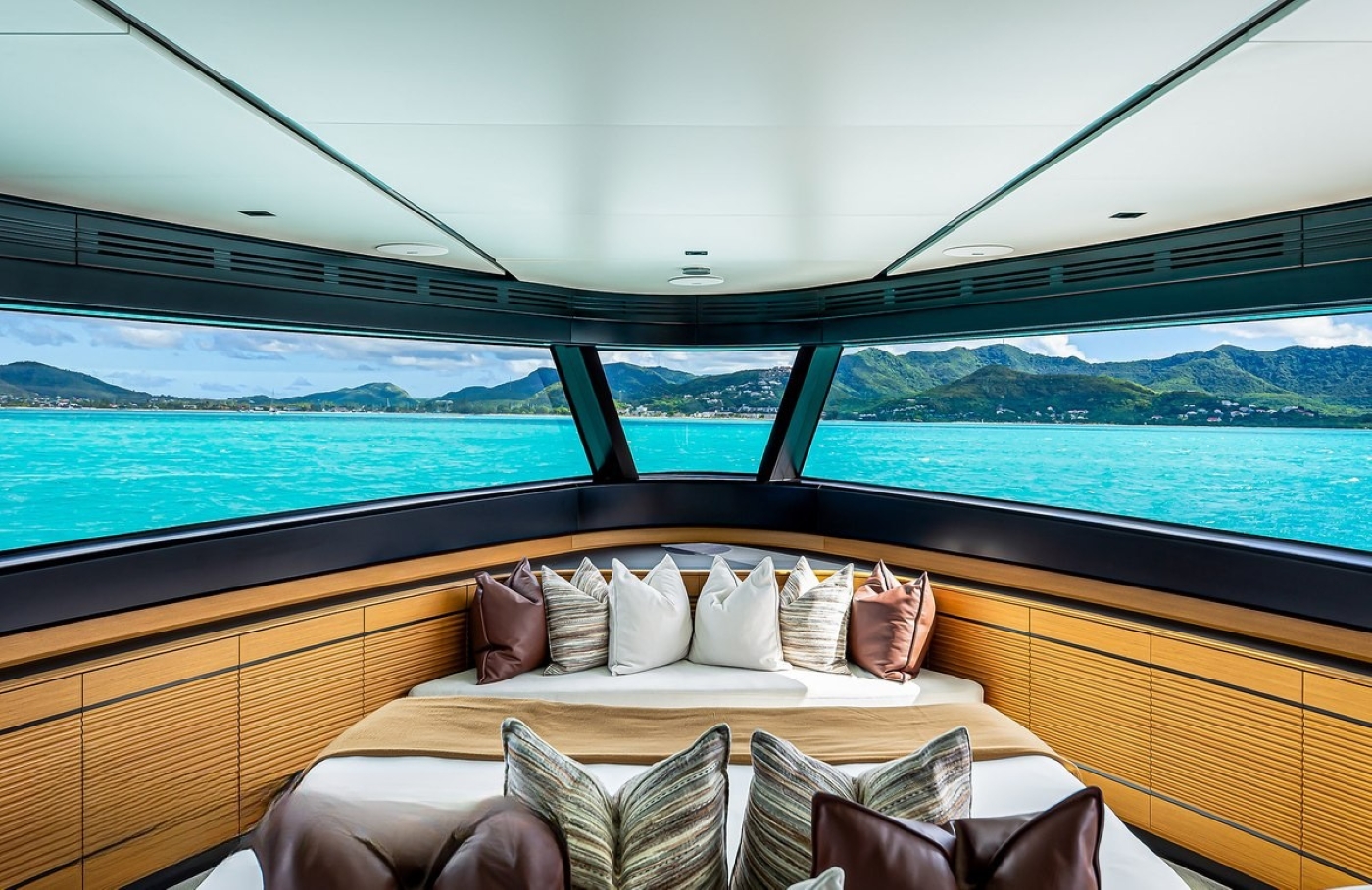 The towering 4.7m bow creates huge interior volume and gives her a unique shape which is further styled using silver paintwork and long dark windows cutting across the vessel. Elegant teak decking surrounds steps that cascade down from the aft deck to the beach club which extends with wings at the side and a hydraulic central swim platform.