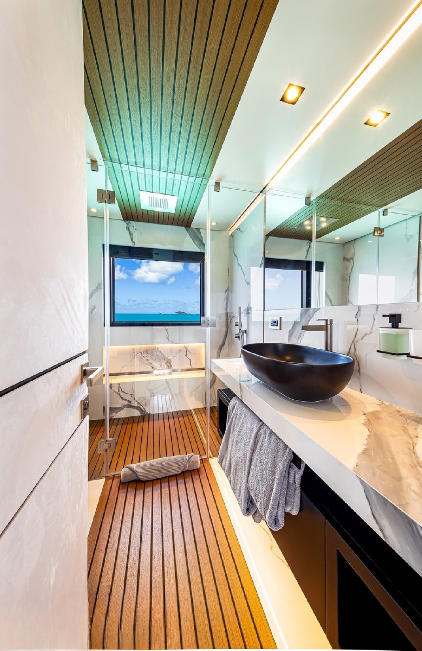 There are three further guest cabins on the lower deck, configured as one full beam VIP forward with his and hers ensuites with central shower plus two doubles, both with generous wardrobe space and ensuite bathrooms.