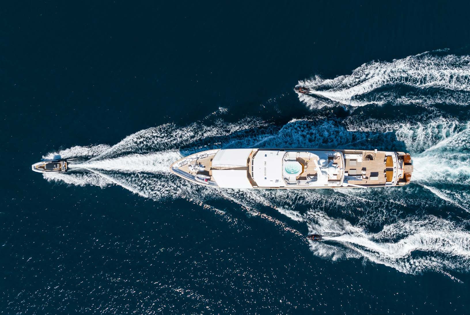 The bridge deck features a generous outdoor space with a crane to launch the water toys which tucks away to create an outdoor lounge and leisure area. Automatic sliding glass doors connect the outside beautifully with the sky lounge.