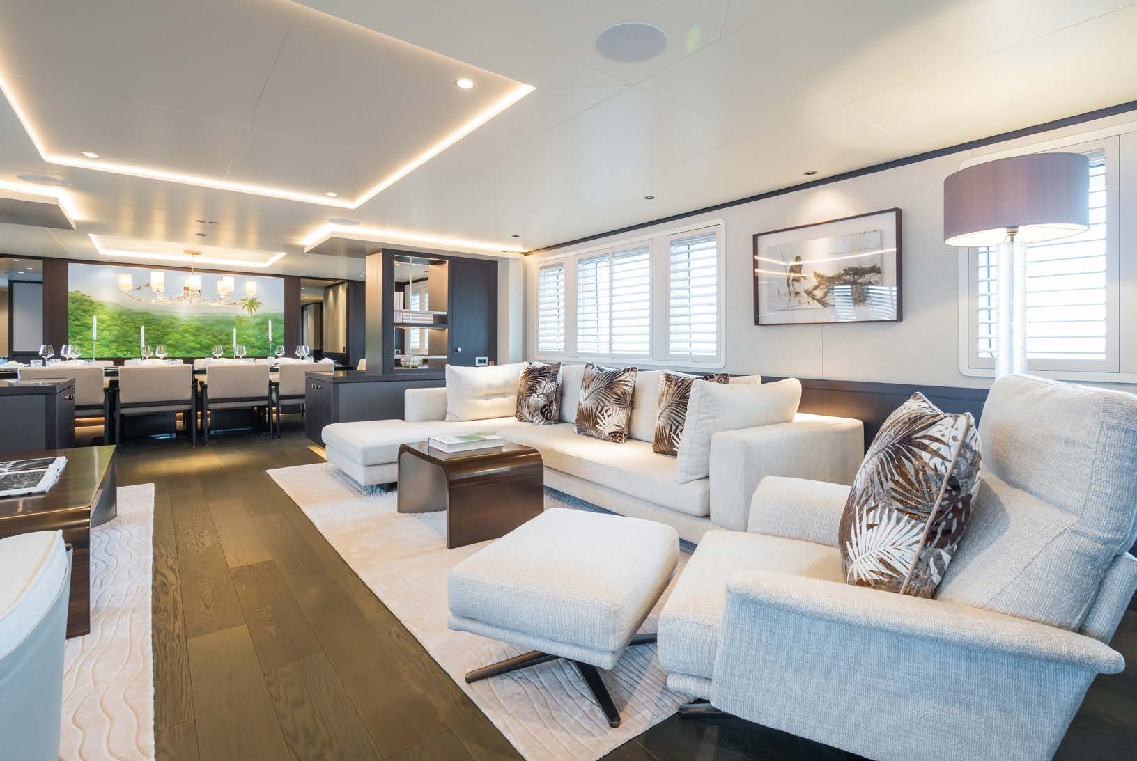 Six staterooms are across the main and lower deck configured as an owner’s suite, a VIP, two doubles and two twins, so she can accommodate as many as 12 guests. Her VIP suite was relocated to the main deck during her refit which provided more crew space across the lower deck.