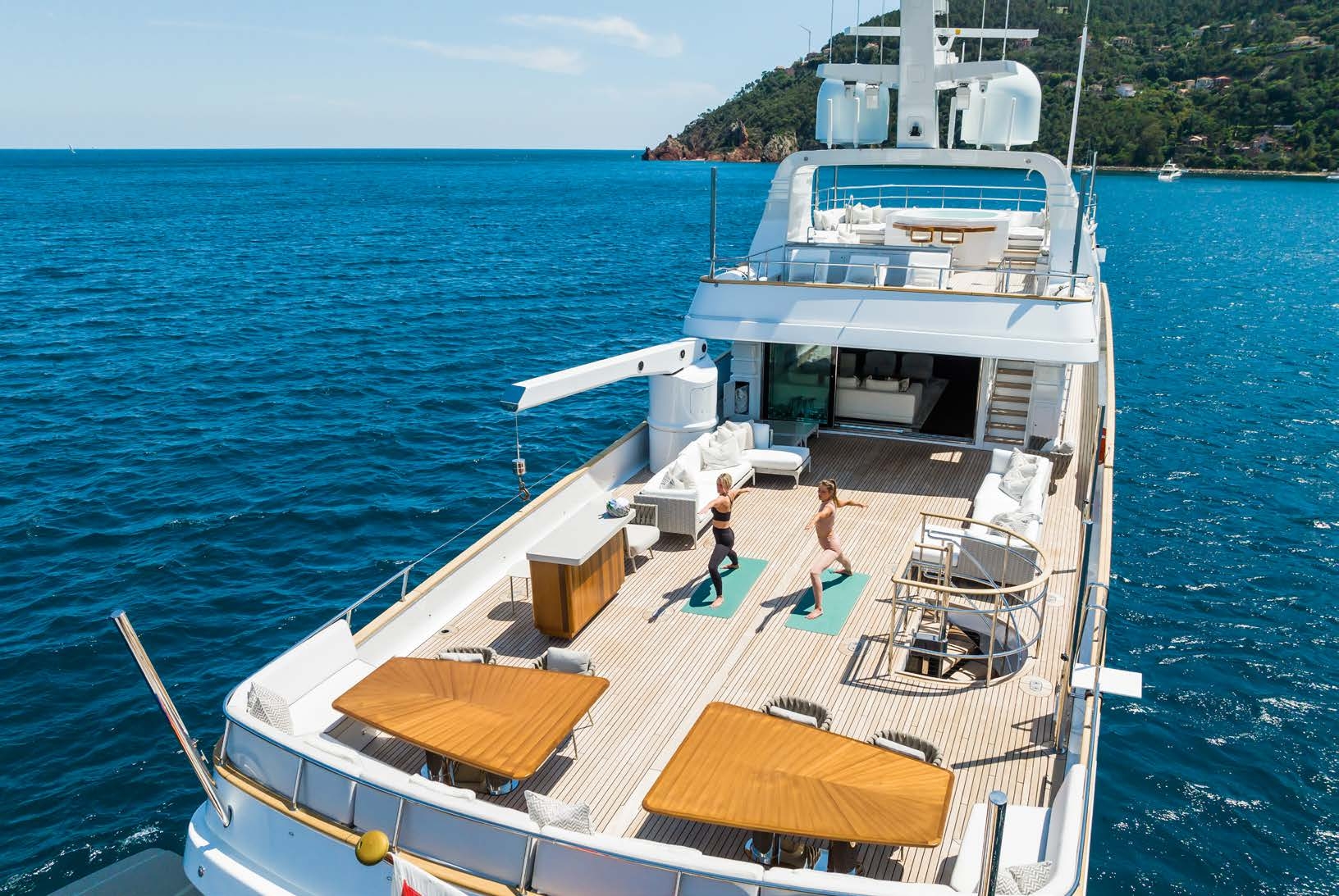 All the decks have been meticulously reclad in teak during the 2023 refit and the colour blends so well with the dark green hull and pearl-white superstructure.