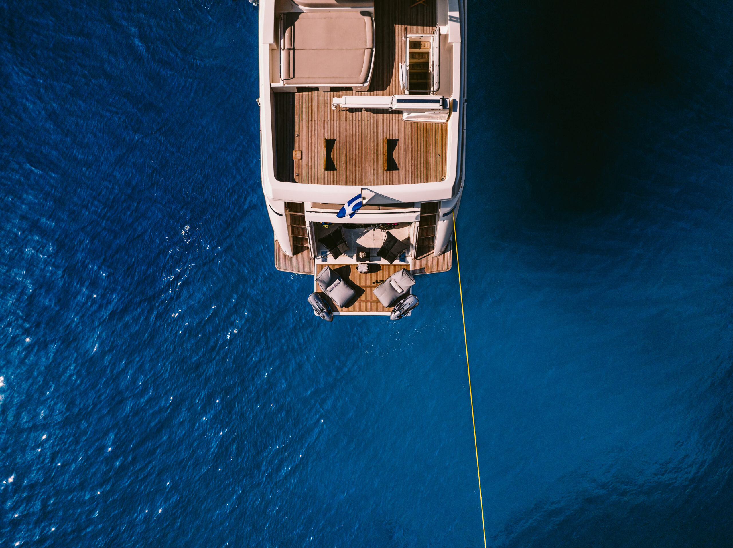 The main deck aft offers a lovely al fresco dining table with bench seating to one side and moveable director style chairs surrounding. Steps lead down to the swim platform which can be set up as a beach club using the on board bean bag sun loungers.