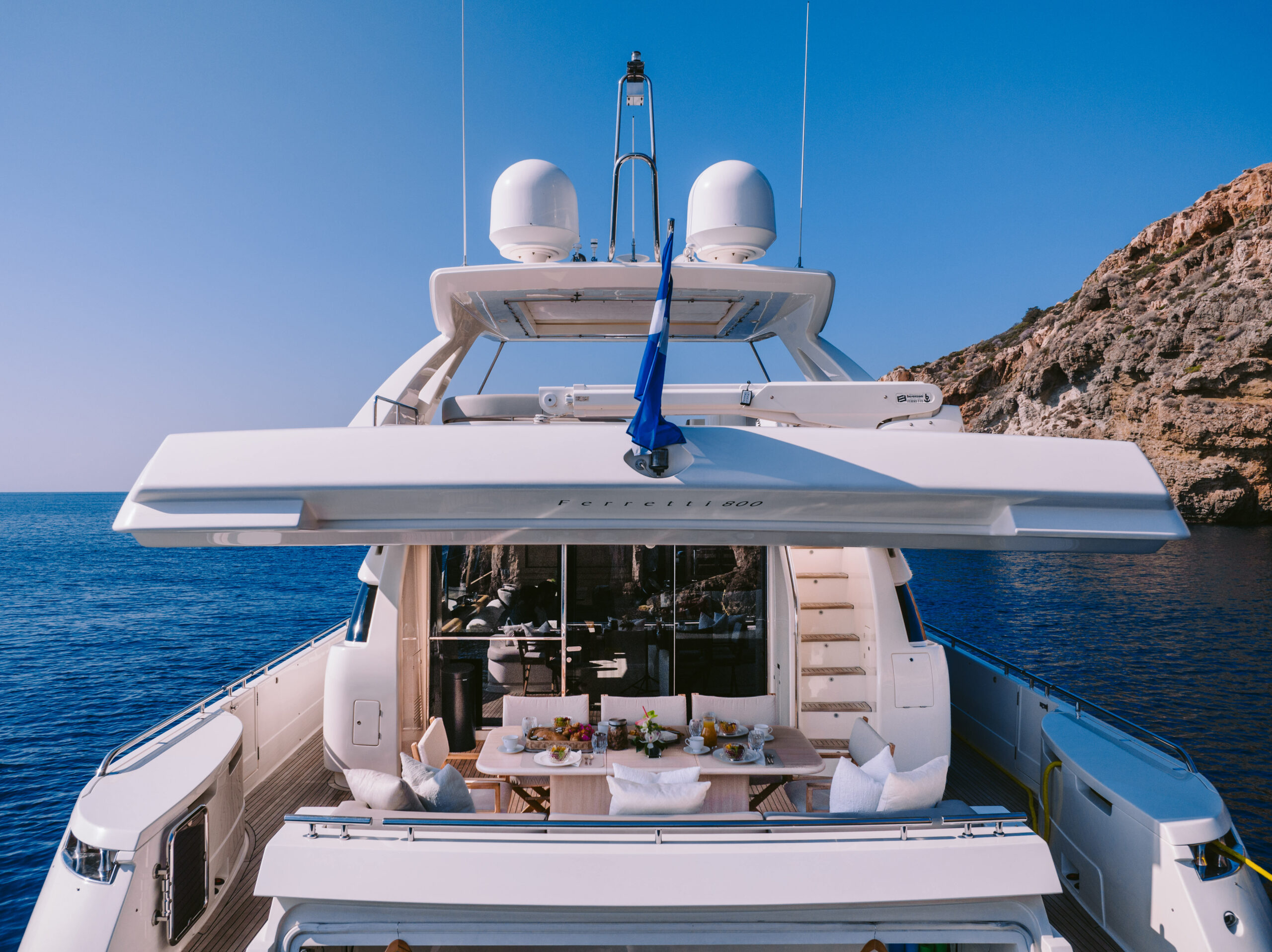 The main deck aft offers a lovely al fresco dining table with bench seating to one side and moveable director style chairs surrounding. Steps lead down to the swim platform which can be set up as a beach club using the on board bean bag sun loungers.