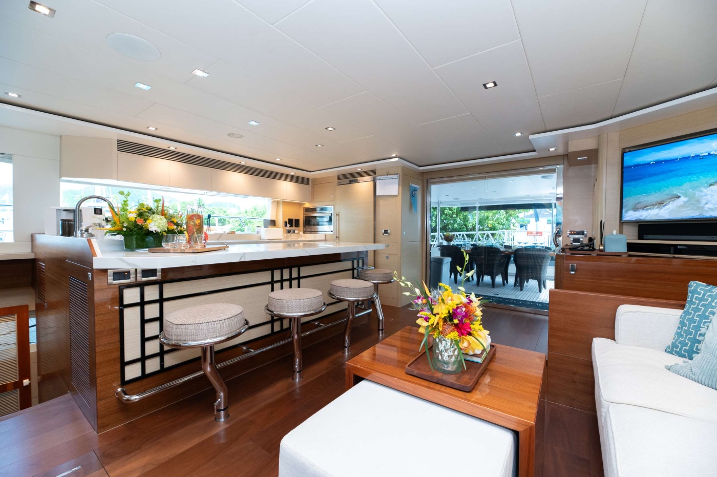 With rich wood throughout the interior, the large windows and light color choices you will feel at ease while on board. Pulling from the blue water you will be jumping into, indoors you can find pops of bright blue to remind you ...