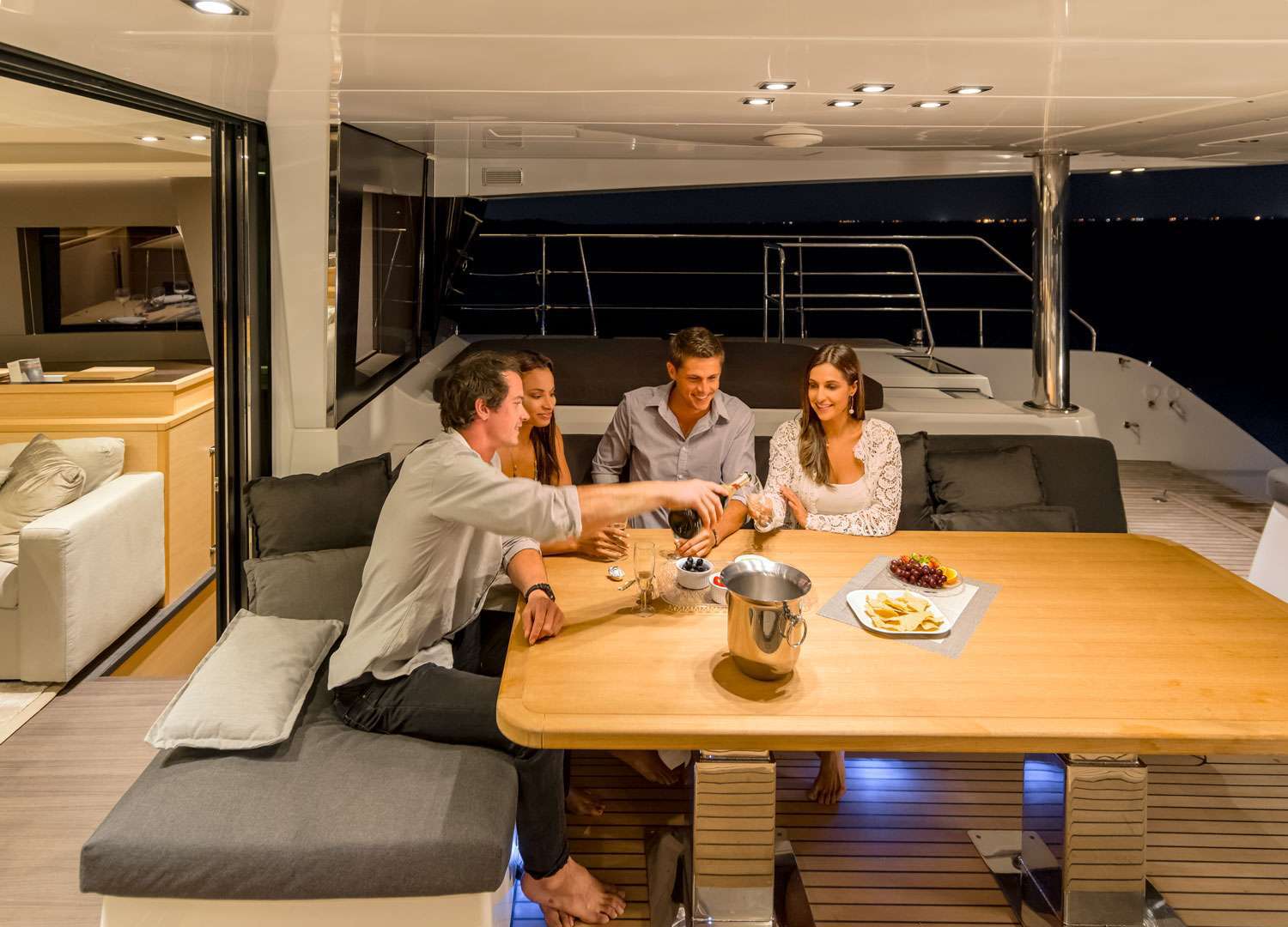 The aft deck offers an al fresco dining option that is protected from weather with a hard top above. The lounge pads on the aft deck provide both sun and shade dependent on your personal desires. Stepping down the aft deck, on ...