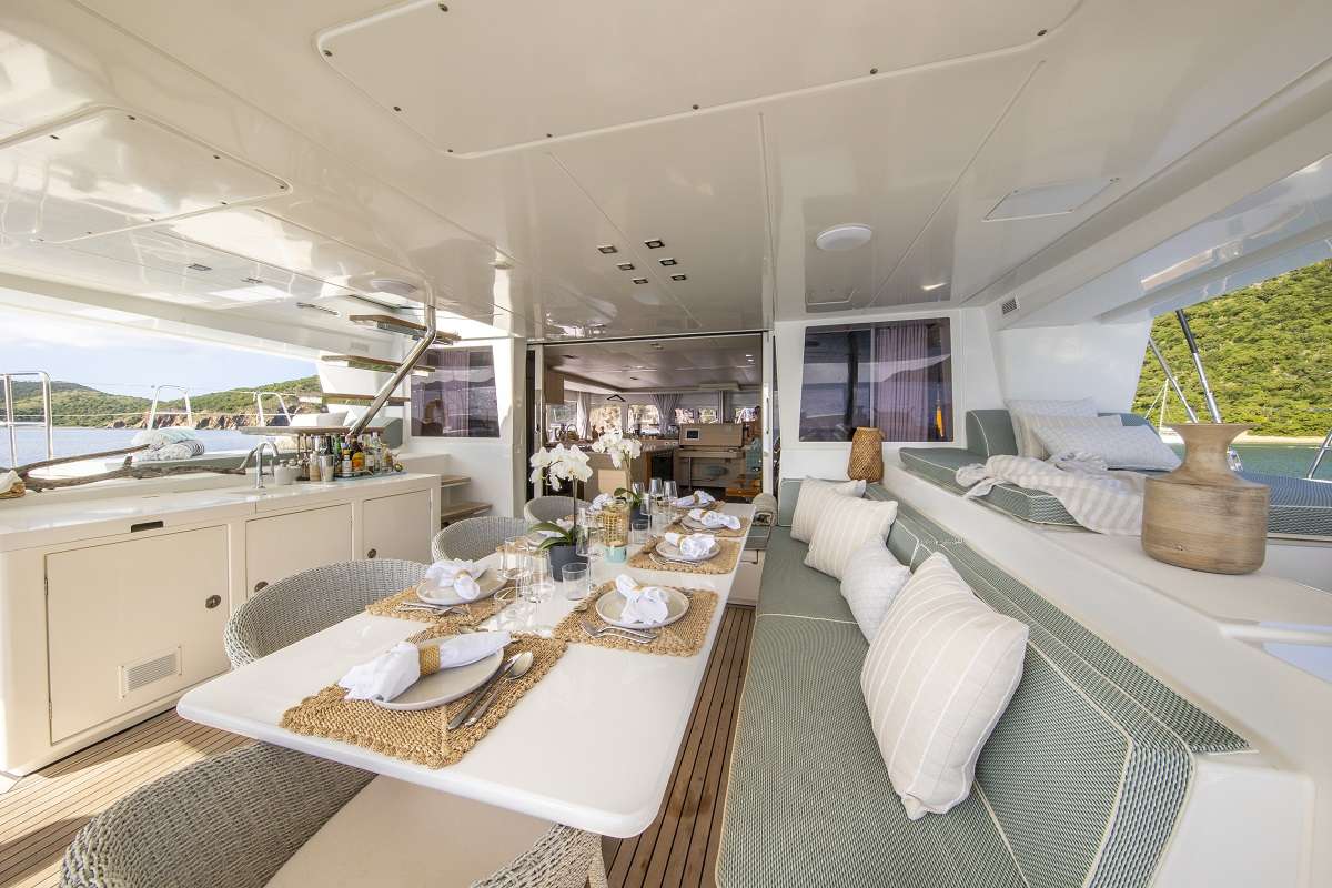 The luxurious fabrics in the pale yet bright blues, automatically create a calm sense when you step into the main salon from the aft deck. The main salon boasts in space and audio amenities with a bluetooth system that brings the fun inside.