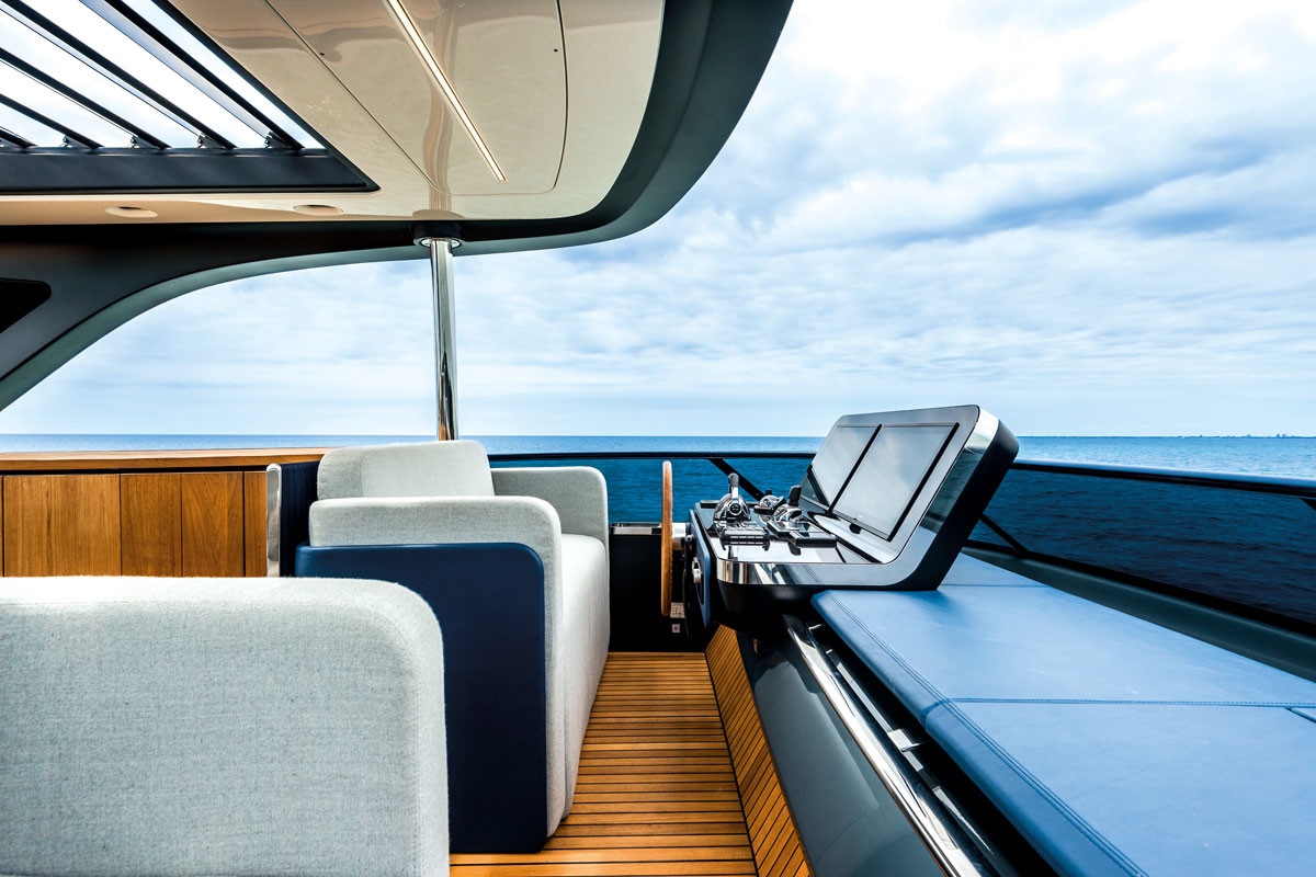 There is also a forward helm station to port with adjacent starboard side sofa.