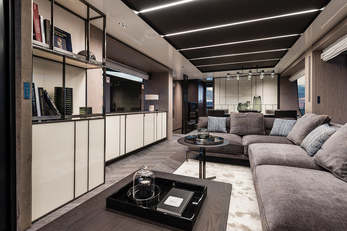 Herringbone wood floors, oversized sofas and a marble topped dining table fill the main salon while panoramic windows and considered lighting bathe the space in light. The lounge is aft while the dining table is placed forward to starboard.