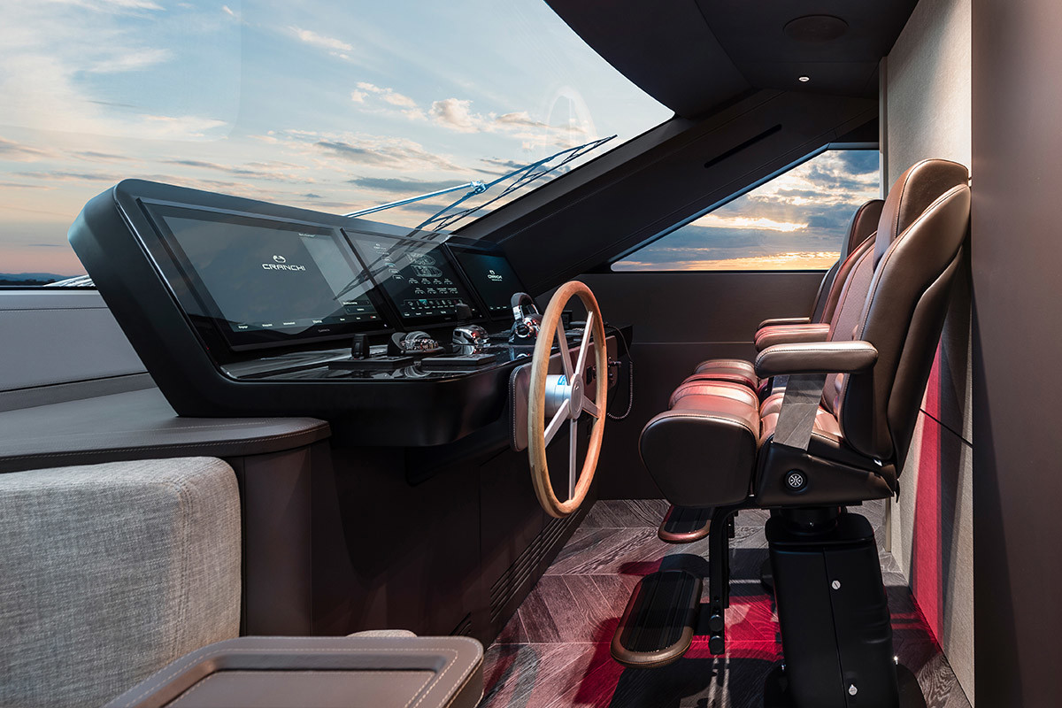 Amidships is the stylish, well-equipped galley and a convenient day head, while forward is the wheelhouse with captain’s chairs and corner banquette guest seating.