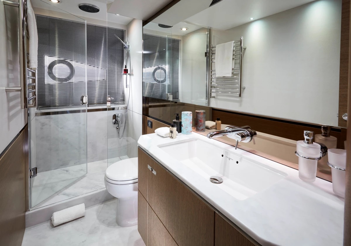 The master suite is full beam amidships with a lounge space, walk-in-wardrobe and luxury ensuite. The VIP suite is forward in the bow, while the twin cabin is in between to starboard. Both benefit from the luxury and privacy of ensuite bathroom facilities.