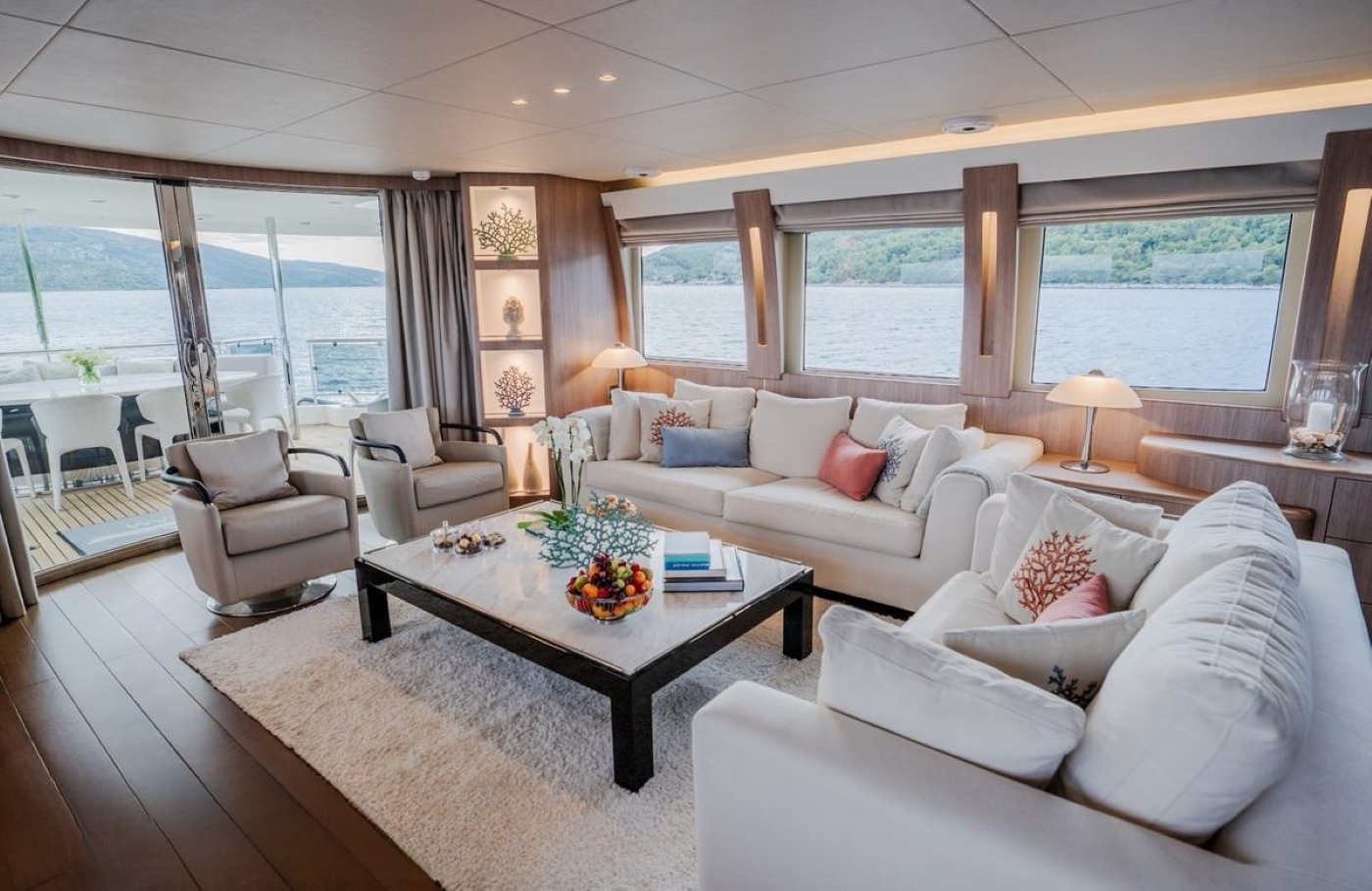 The stylish and light-filled main salon features a collection of comfortable sofas and armchairs and a formal dining setting – both styled with a neutral colour scheme - set against warm wooden flooring and cabinetry.