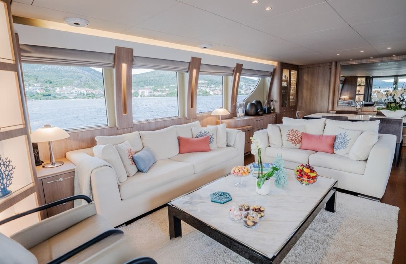 The stylish and light-filled main salon features a collection of comfortable sofas and armchairs and a formal dining setting – both styled with a neutral colour scheme - set against warm wooden flooring and cabinetry.