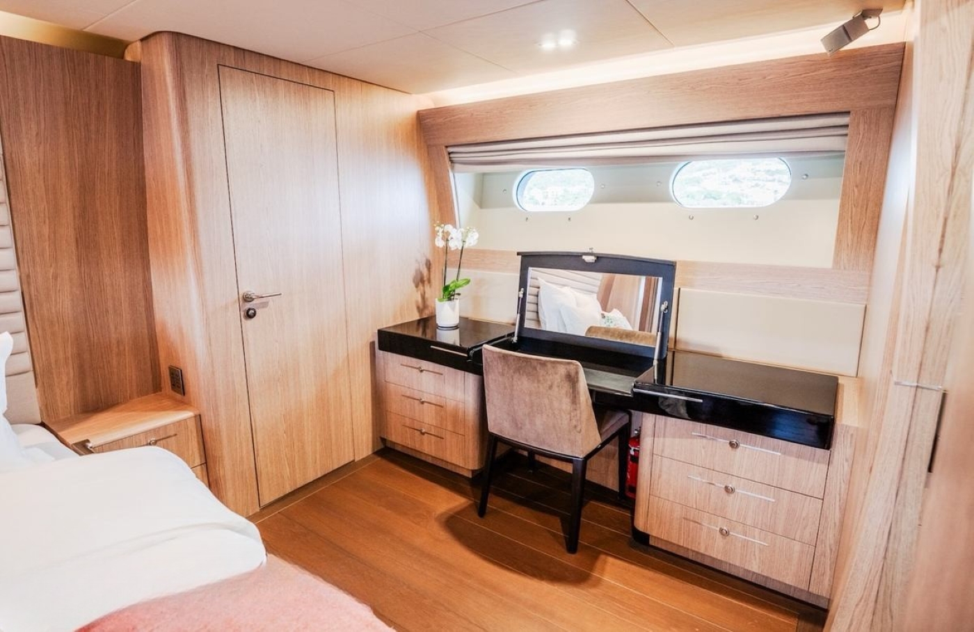 For a peaceful afternoon sunbathing, guests can head to the foredeck and lie back on the row of comfortable sun pads or enjoy a drink at the table.