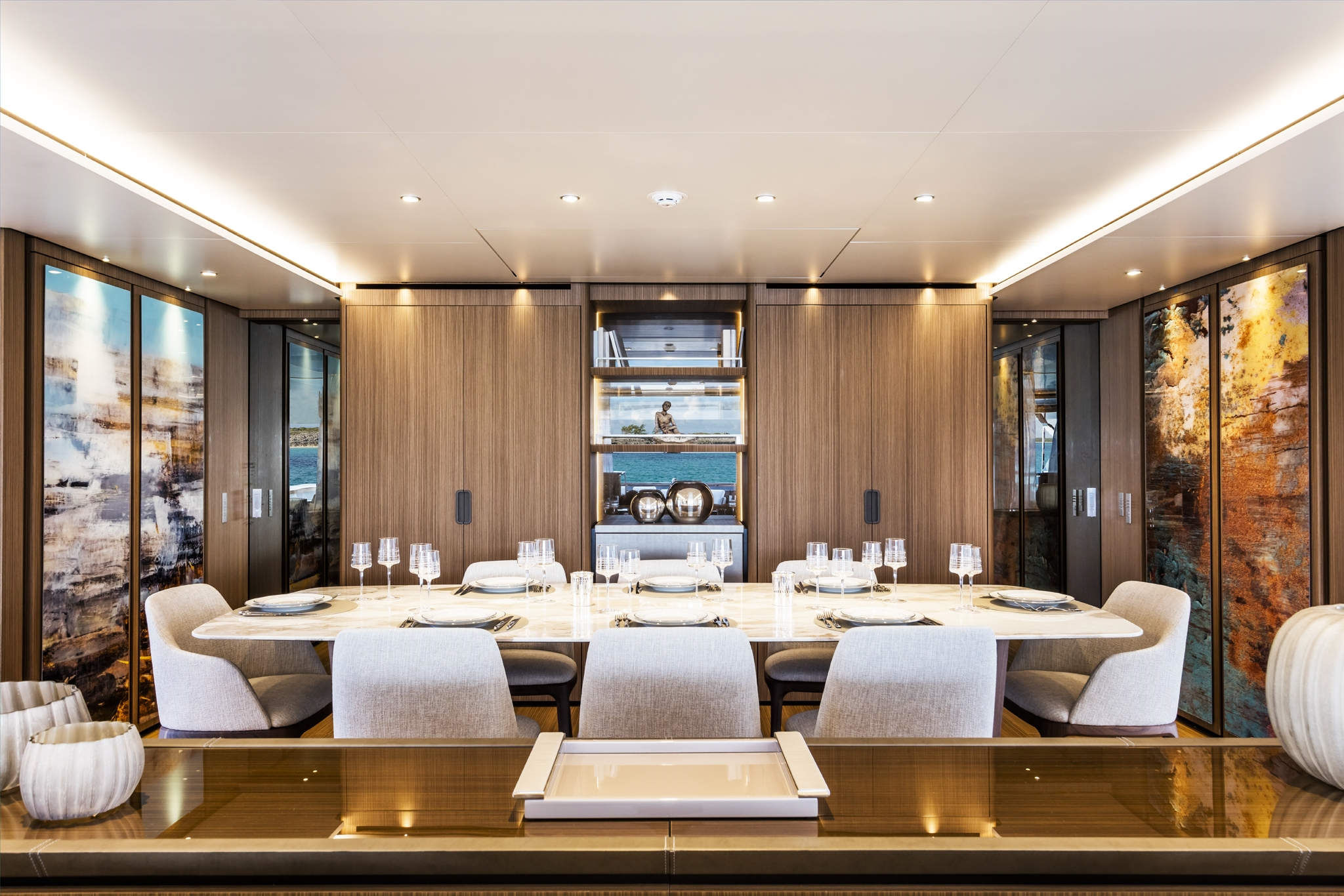 The light and bright main salon is the primarily sociable space on the interior of this luxury yacht. There is a lounge aft and dining table forward in the space set against a warm wooden floor, neutral furnishings and billowing white curtains at the floor-to-ceiling windows.