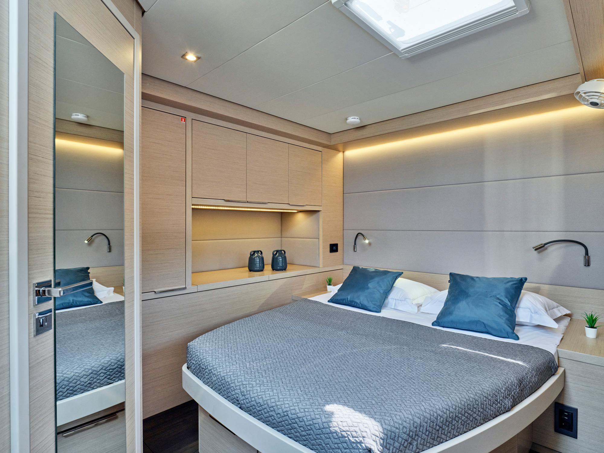 Various shades of wood blend with other neutral soft furnishings to offer a contemporary atmosphere configured as a lounge/diner with a flexible table being either a low coffee table or raised and opened-up dining table. The galley and navigation station are aft in the space.