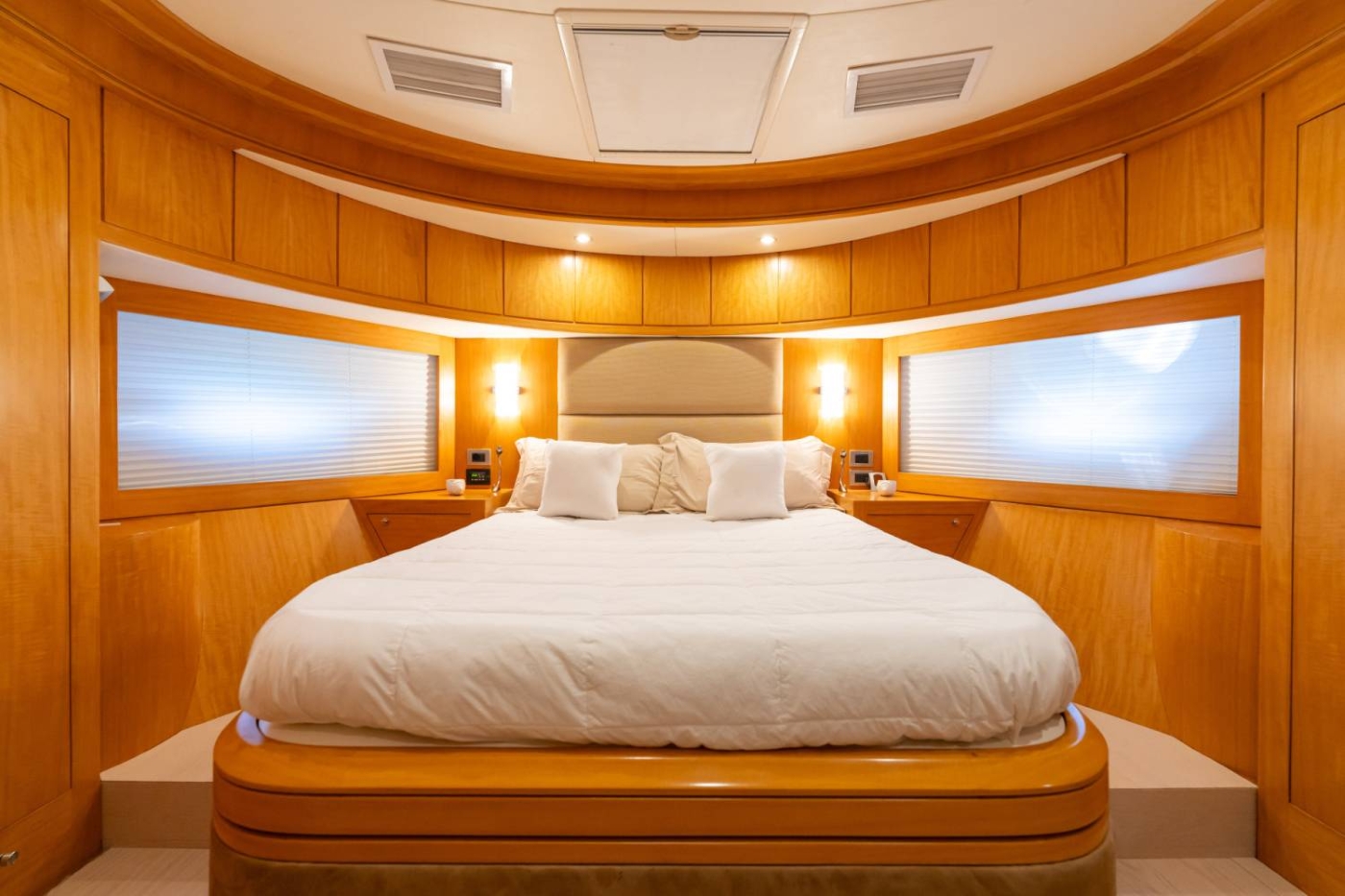 There is also a generous al fresco dining setting on the main deck which leads down to the water’s edge swim platform and beach club from where the crew will launch the array of water toys.