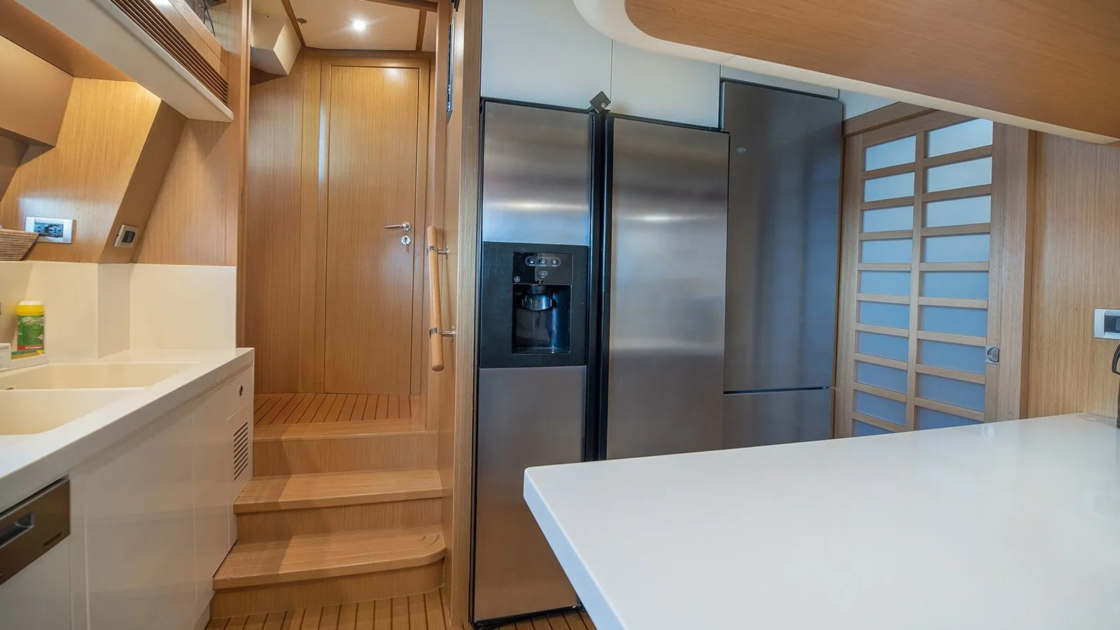 There is a lounge aft and a dining room forward which leads through to a lobby and the galley. Further forward on the main deck is the VIP suite. Stairs to starboard from the lobby lead down to the additional guest accommodation on the lower deck.