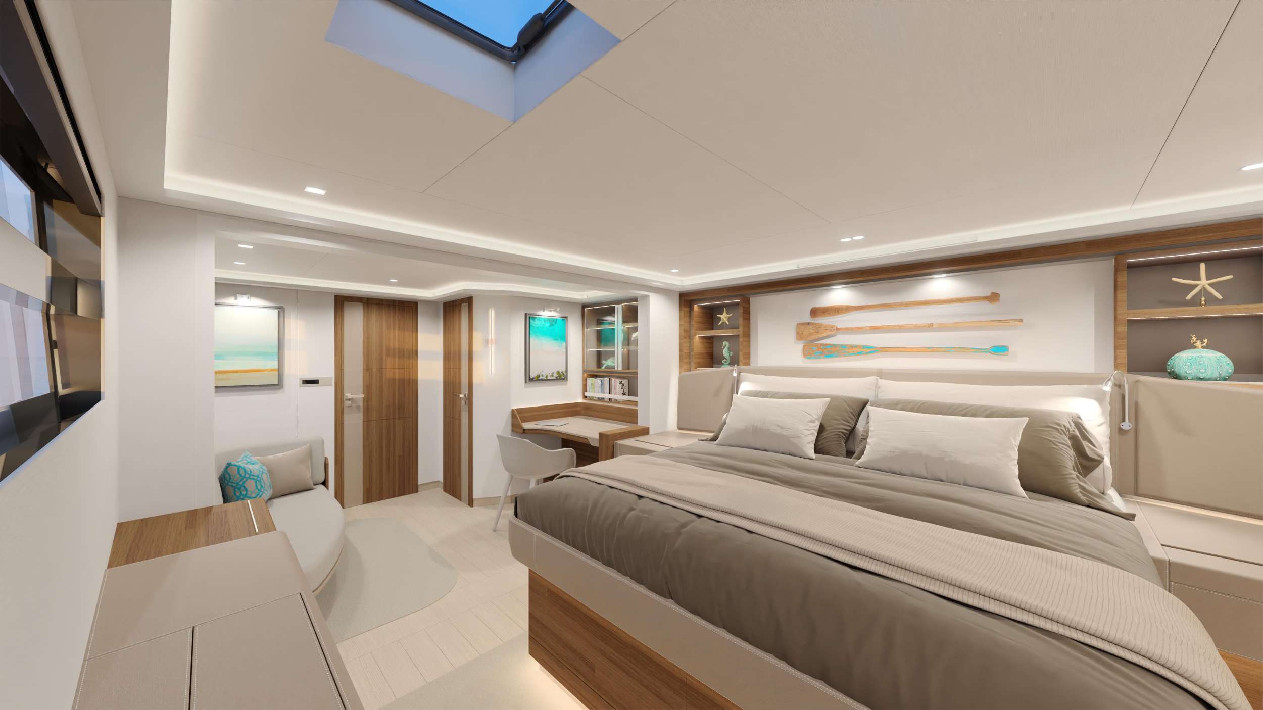 The master suite and two double cabins are in the starboard hull while two doubles fil the forward port hull leaving space for the galley and crew accommodation aft.